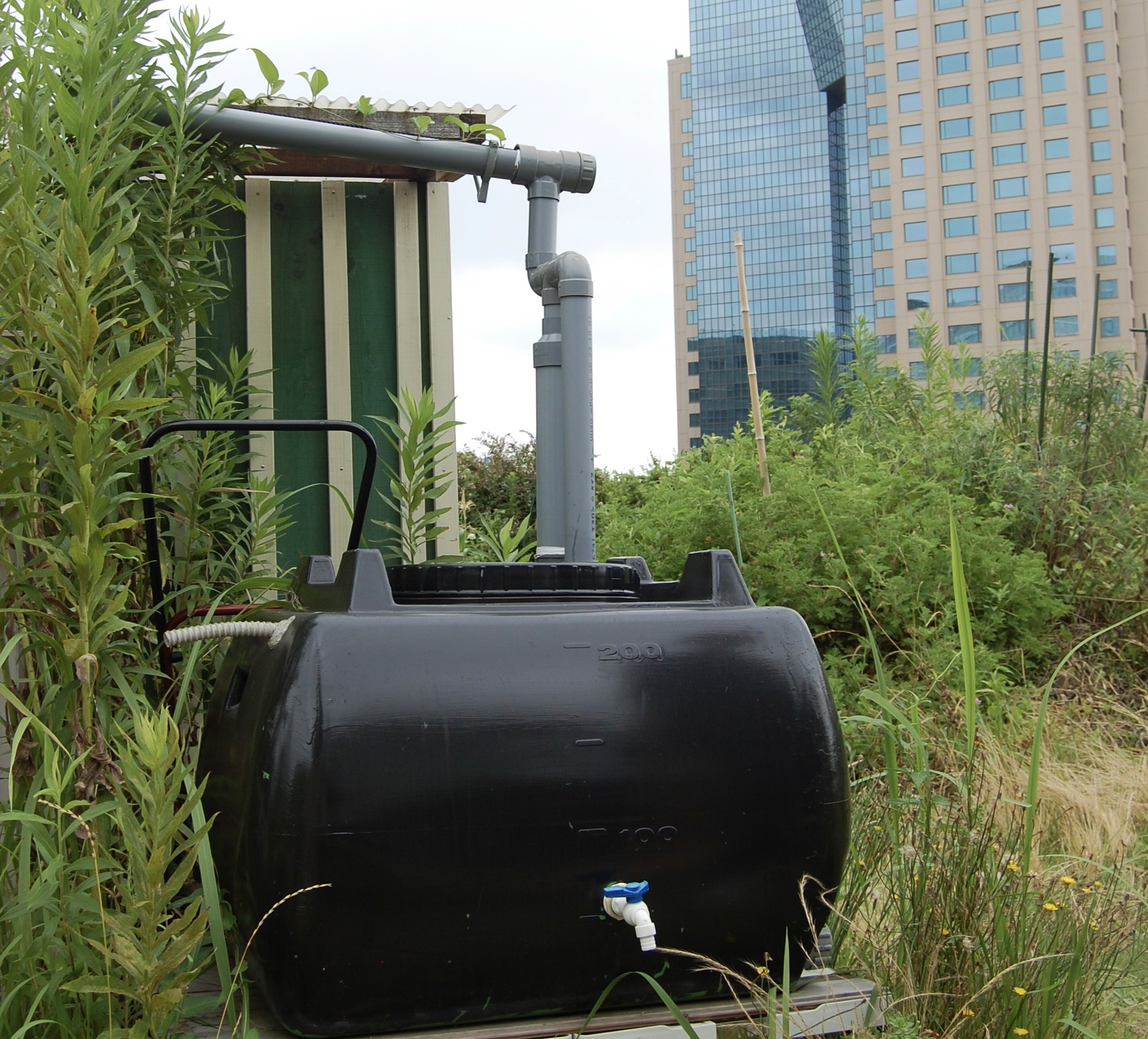 物置き古屋の屋根に降った雨を貯めるタンク。ファーストフラッシュというしくみで水を綺麗にし、水やりなどに使用している。